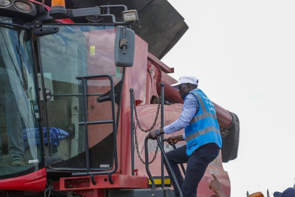 Cabinet Secretary of Water and Irrigation, Hon. Eric Mugaa climbing an agricultural tractor during the first maize harvest at Galana Kulalu